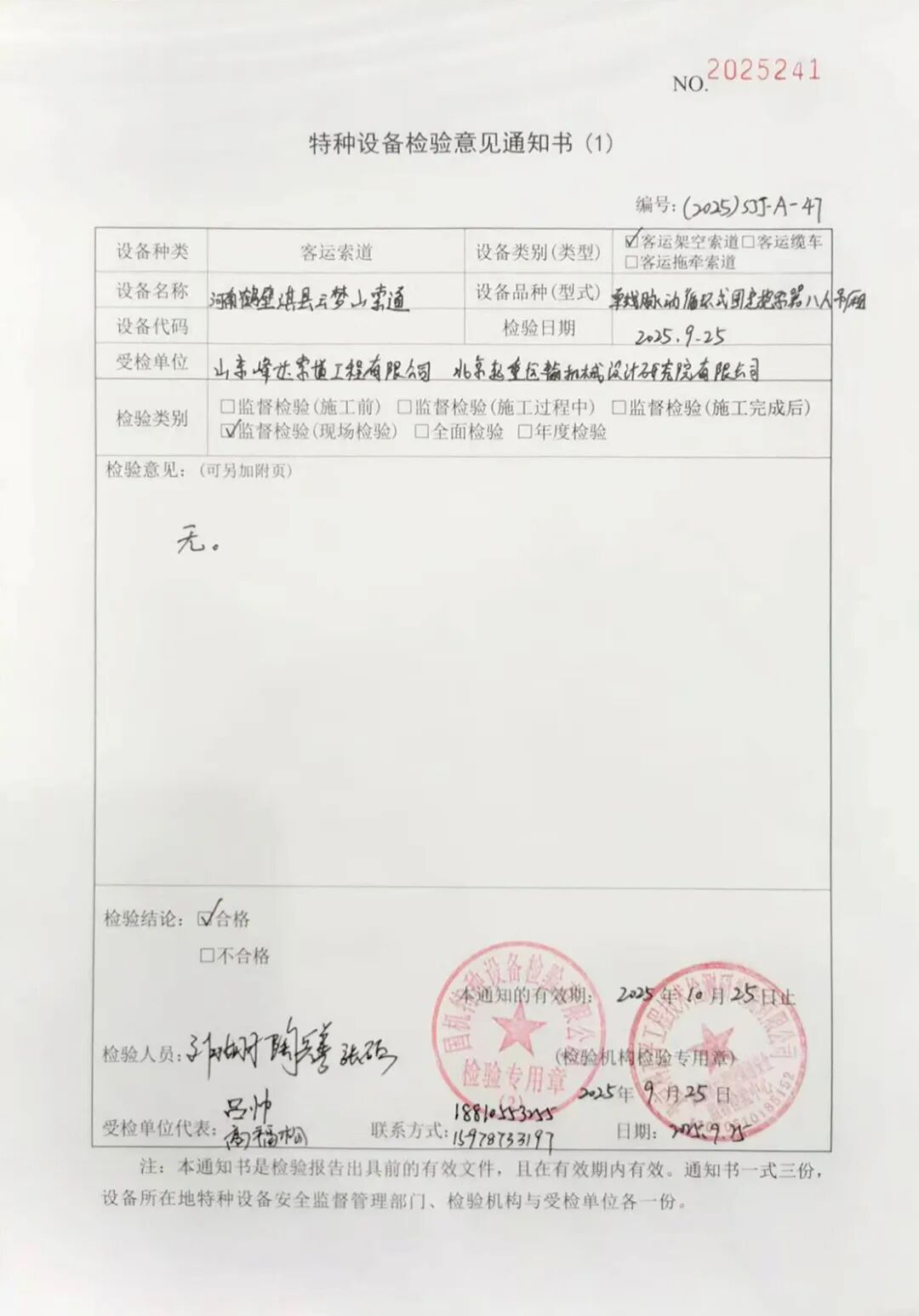 2025年9月25日,國家索檢中心人員經過多日的現場檢驗,正式下發了檢驗意見通知書,檢驗合格,標志著云夢山索道可以投入運營。 ![]()